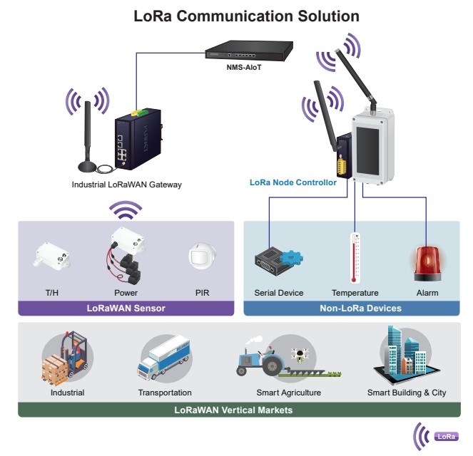 Múltiples usos: el controlador LN502 es una solución IoT flexible y eficiente perfecta para conectar sensores Modbus tradicionales y dispositivos integrados como sensores de temperatura y sistemas de seguridad. Al convertir las conexiones cableadas en redes LoRa inalámbricas, elimina las limitaciones de la infraestructura cableada y permite una transmisión de datos confiable a larga distancia. Cuando se combina con una puerta de enlace LoRa de la serie LCG de Planet, transmite datos sin problemas al servidor de red para una administración centralizada, lo que mejora la eficiencia operativa.