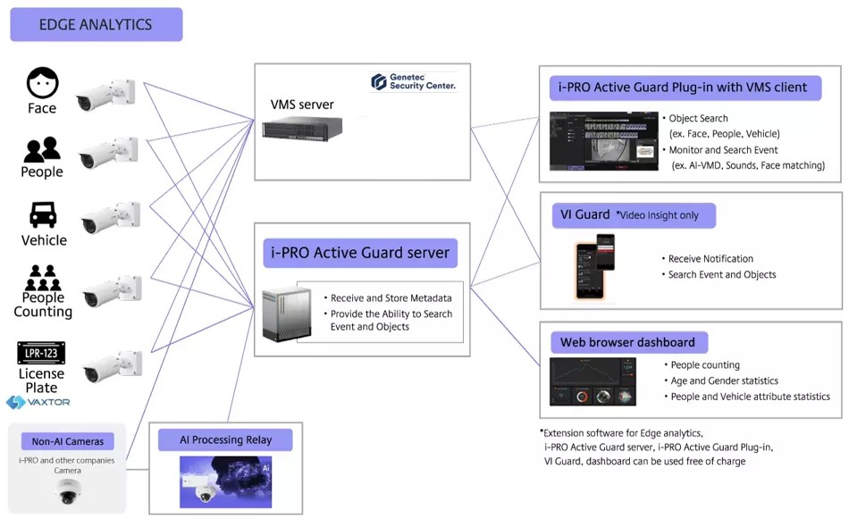 A diferencia de otras soluciones que dependen de servidores externos costosos para el análisis, i-PRO Active Guard realiza la detección y el análisis directamente en las cámaras de red i-PRO con inteligencia artificial. Este enfoque de análisis en el borde elimina la necesidad de servidores de análisis adicionales, reduciendo significativamente los costos y simplificando la infraestructura del sistema. La gestión de video se realiza a través del software de gestión de video (VMS).