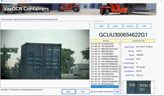 VaxOCR Containers permite el reconocimiento automático de códigos de contenedores en formato ISO 6346, utilizando tecnología de reconocimiento óptico de caracteres (OCR). Su potente motor lee los códigos horizontales y verticales en tiempo real e informa el número de código junto con otros metadatos como la hora, la posición GPS, el tipo de contenedor y las dimensiones para facilitar su seguimiento.