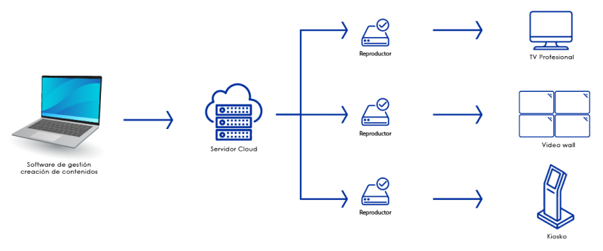 - Señalización digital en la nube: la plataforma SpinetiX ARYA™ CMS posibilita la gestión centralizada y la supervisión de los contenidos de cartelería digital. Permite a los usuarios monitorizar el estado de sus dispositivos, recibir alertas en tiempo real y realizar actualizaciones en múltiples ubicaciones desde cualquier lugar, asegurando un funcionamiento sin interrupciones.