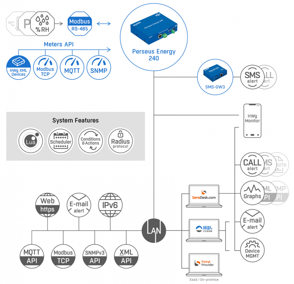 - API de medidores (LAN): dispositivos HWg XML, Modbus/TCP, SNMP, MQTT. Como dispositivo de la familia Perseus, puede conectarse vía LAN a otros dispositivos en la misma red y analizar los datos de sus sensores.