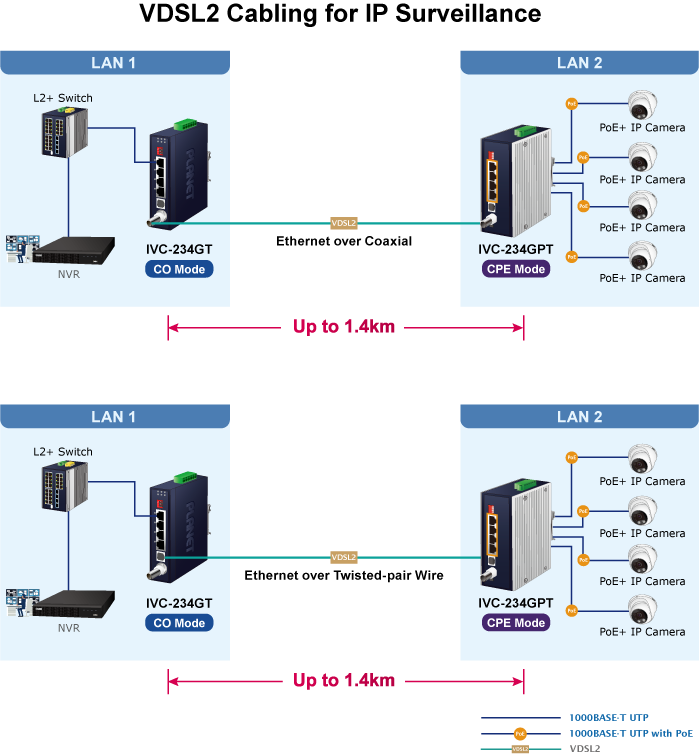 Para satisfacer las necesidades de alta velocidad y larga distancia en aplicaciones de Ethernet sobre cable coaxial o telefónico, nuestro partner Planet Networking ofrece el IVC-234GPT, un extensor Gigabit Ethernet sobre VDSL2, de última generación y alto rendimiento, que cuenta con el nuevo perfil VDSL2 Super Vector 35b.
