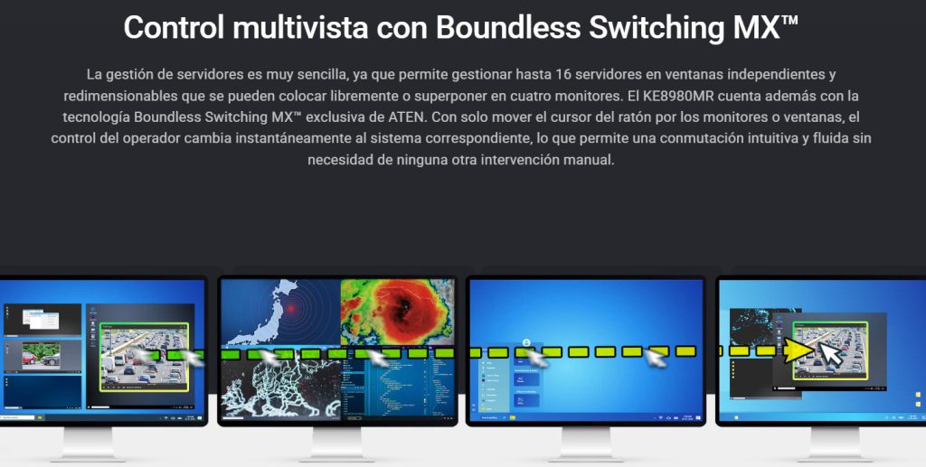 Tecnología Boundless Switching MX™ (exclusiva de ATEN): con solo mover el cursor del ratón por los monitores o ventanas, el control del operador cambia instantáneamente al sistema correspondiente, lo que permite una conmutación intuitiva y fluida sin necesidad de ninguna otra intervención manual, acelerando la respuesta ante eventos críticos.