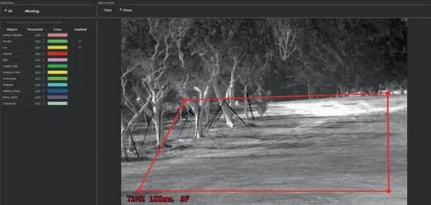 Perímetros virtuales: permite dibujar áreas y líneas virtuales para la detección de incendios u objetos en movimiento en zonas restringidas, con clasificación por colores, y cuenta con la capacidad de crear listas blancas de objetos. Las zonas de seguridad virtuales funcionan con sensores diurnos/nocturnos o térmicos, proporcionando una seguridad avanzada 24/7.