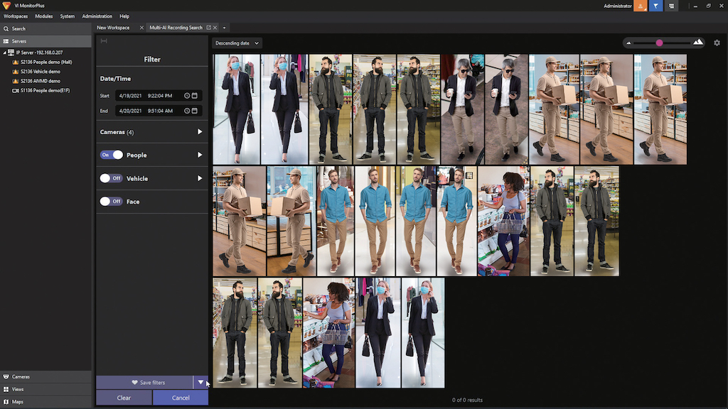 Las funciones de búsqueda de i-PRO Active Guard permiten localizar y visualizar rápidamente a personas y vehículos captados por las cámaras de i-PRO con inteligencia artificial. El sistema ofrece un enorme listado de atributos de búsqueda, incluyendo sexo, edad, color de la ropa, características faciales, tipo de vehículo, color y dirección de movimiento.