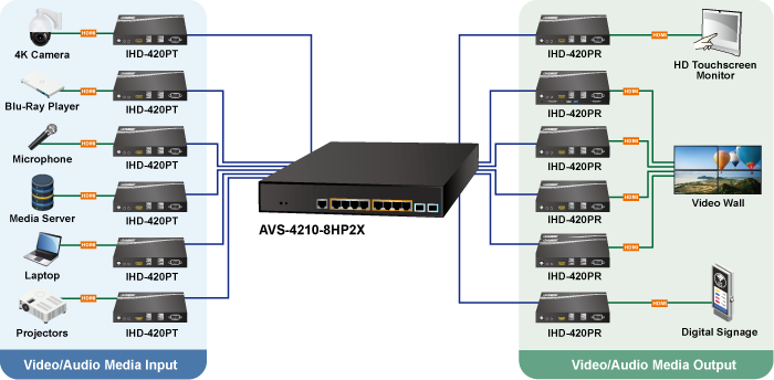 El switch AVS-4210-8HP2X facilita la convergencia de diversas entradas AV procedentes de dispositivos como cámaras 4K, micrófonos, reproductores Blu-ray, servidores multimedia y portátiles. Estas entradas se codifican, se transmiten por Ethernet y se decodifican para su envío a diversos dispositivos de salida, incluyendo pantallas táctiles HDTV, señalización digital, proyectores, videowalls y televisores inteligentes.