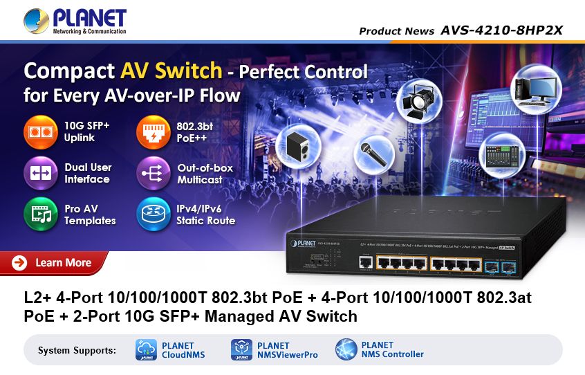La creciente demanda de transmisiones de audio y vídeo de alta calidad sobre IP exige infraestructuras de red robustas y especializadas. Respondiendo a este desafío, nuestro partner Planet Networking presenta el AVS-4210-8HP2X, un switch gestionable L2+ diseñado específicamente para aplicaciones audiovisuales profesionales. Esta solución combina alta potencia, gestión avanzada y una integración optimizada para protocolos AV sobre IP, posicionándose como una herramienta esencial para integradores de sistemas, técnicos y profesionales de la industria audiovisual.