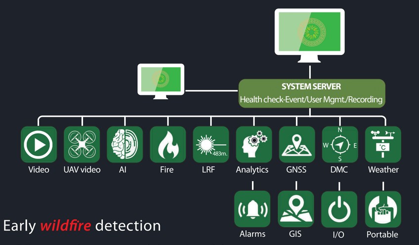Detección automática de incendios: el sistema realiza un escaneo automatizado de 360º para detectar incendios “sobre la marcha” y clasificar eventos mediante algoritmos de inteligencia artificial. La plataforma controla cámaras térmicas avanzadas de largo alcance y cámaras diurnas/nocturnas con sensores de alto rendimiento y ópticas de largo alcance. Es capaz de detectar incendios forestales o industriales incluso a kilómetros de distancia.