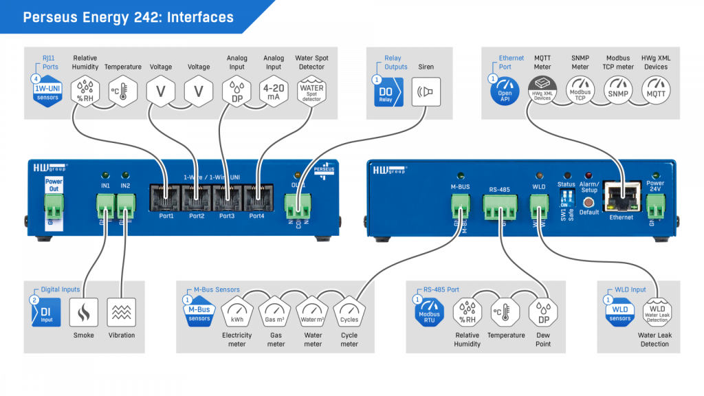 El Perseus Energy 242 se desempeña como concentrador de datos remotos de todos los sensores/medidores locales y es la solución perfecta para la monitorización remota de las condiciones ambientales en salas técnicas, invernaderos, almacenes de alimentos o farmacéuticos, maquinarias industriales e infraestructuras críticas.